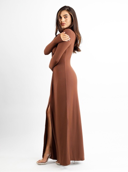 The Popilush Built-In Shapewear Deep V-Neck Twist Split Maxi Dress with a Body-hugging fit and a V-neck is suitable for wedding, party, date, honeymoon trip, and shopping. Compatible with everyday outfits like tops, and cardigans.